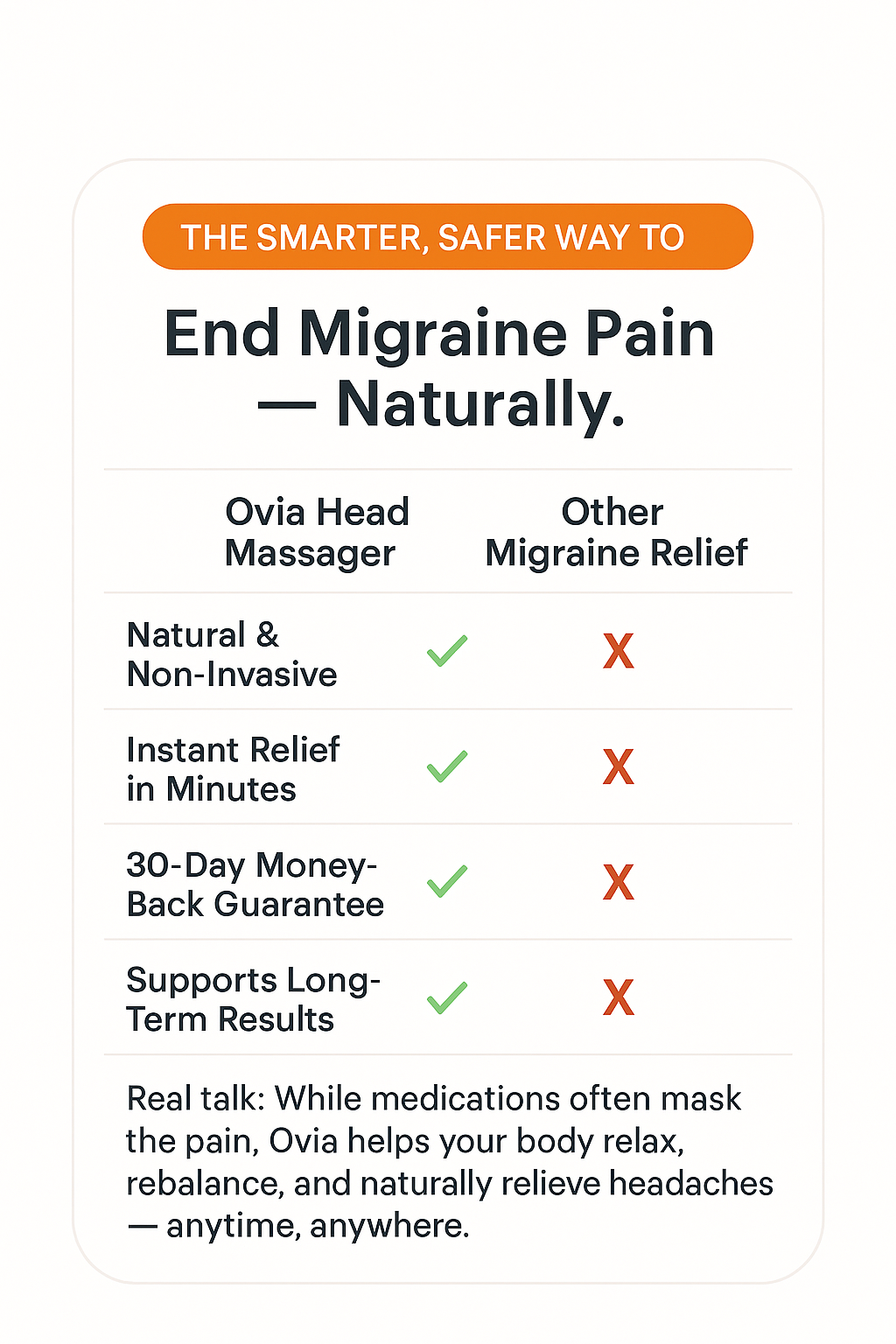 Stop letting migraines control your day. The Ovia™ Head Massager uses gentle, targeted pressure to relax tense muscles and restore circulation — giving you fast, natural relief without medication or side effects.